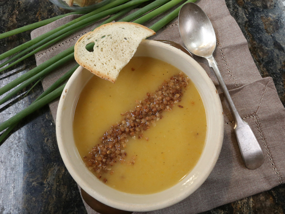 Podawać z grzankami z chleba – pieczywo pokroić w kostkę i wysuszyć. Następnie obsmażyć na złoty kolor na oleju z dodatkiem masła. Udekorować ugotowaną i dodatkowo uprażoną kaszą.