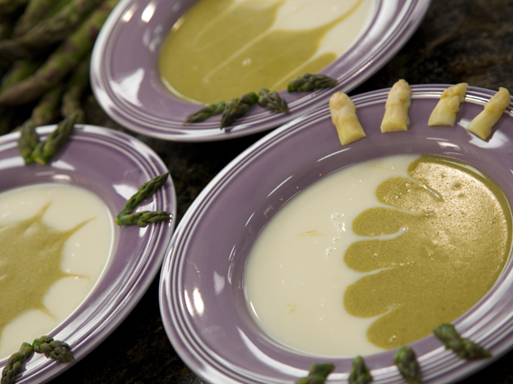 Na talerzu ułożyć ugotowane osobno szparagowe główki i zalać kremem. Główki można też położyć na brzegu talerza. Jeśli robimy wersję bardzo wykwintną, w identyczny sposób gotujemy zupę z białych szparagów i jednocześnie wylewamy na talerz dwa kremy.