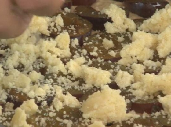 Cało¶ć dokładnie wymieszać. Wylać na blachę natłuszczon± masłem. Ułożyć połówki ¶liwek (skórk± do dołu) i posypać kruszonk±.