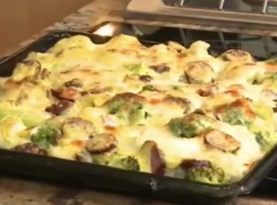Brokuł i kalafiora podzielić na cząstki, pora pokroić na 3-centymetrowe kawałki. Wszystko zblanszować (w posolonym i posłodzonym wrzątku - brokuły nie stracą koloru). Rozłożyć na przemian na blasze, posypać wędliną (lub pieczonym mięsem, które zostało w domu po świętach). Na wierzchu ułożyć mozzarellę pokrojoną w plastry.