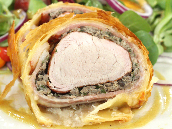 Na dość dużym kawałku folii spożywczej ułożyć plastry boczku – tak, by zachodziły na siebie. Na boczek nałożyć farsz grzybowy, na grzyby dać obsmażoną polędwiczkę wieprzową i bardzo szczelnie zawinąć – za pomocą folii. Boki zakręcić, całość zrolować tak, by powstał duży „cukierek”. Wstawić do lodówki na mniej więcej 2 godziny.