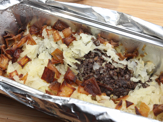 Do foremek aluminiowych nałożyć połowę kiszonej kapusty (wcześniej drobno posiekać). Na kapuście ułożyć kaszankę i przykryć resztą kapusty. Posypać prażoną cebulą. Zawinąć w folię aluminiową i upiec na ruszcie.