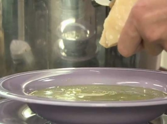 Zdjąć z ognia, dorzucić listki bazylii. Przyprawić solą, pieprzem i imbirem. Ponownie zmiksować. Na talerzu udekorować listkami parmezanu i bazylią. Skropić oliwą.