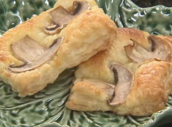 Z gotowego ciasta francuskiego wyciąć kwadraty lub prostokąty. Ułożyć na blasze piekarnikowej. Każdy kawałek posmarować rozmąconym jajkiem i ułożyć plasterek wycięty z pieczarki (bardzo cienki, w kształcie całego grzyba - kroimy wzdłuż pieczarki). Oprószyć solą i upiec w piekarniku na złoty kolor - temp. 200 st. C, 12-15 minut.