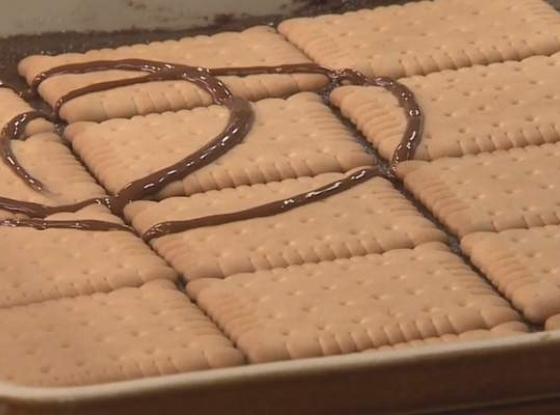 Na dnie foremki ułożyć herbatniki (liczba paczek zależy od wielkości blaszki). Zalać gorącą masą i ułożyć drugą warstwę herbatników.