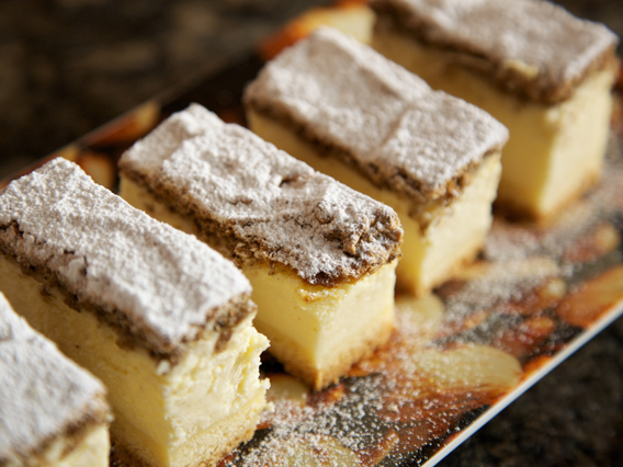 Białka ubić na sztywno ze szczyptą soli. Utrwalić cukrem. Gdy piana stanie się szklista i sztywna, dodać zmielone orzechy, mąkę i bułkę tartą. Bardzo delikatnie wymieszać drewnianą łyżką. Przełożyć na masę serową. Wyrównać. Wstawić do pieca nagrzanego do 180 st. C na 1 godzinę i 20 minut.