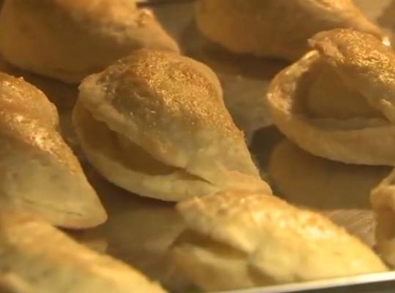 Następnie rozwałkować jak na pierogi. Wykroić kółka, na każde dać kawałek obranego jabłka. Złożyć na pół, skleić, ułożyć na blasze natłuszczonej masłem, posmarować rozm±conym jajkiem. Piec na złoty kolor - 20 minut w temp. 180 st. C.