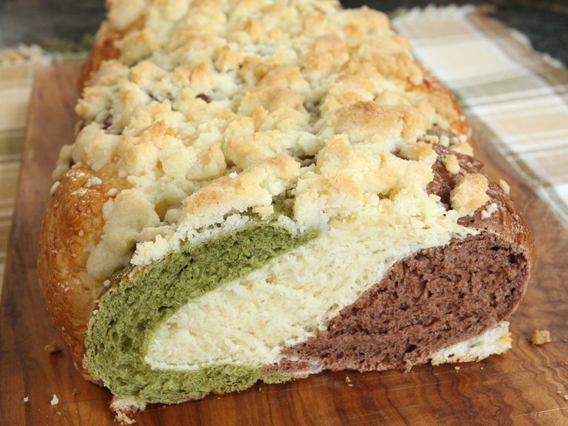 Ciasto podzielić na 3 mniej więcej równe części. Do jednej dodać kakao, do drugiej herbatę matcha (do trzeciej nic nie dodawać). Wyrobić, aby ciasta zmieniły kolor. Stolnicę podsypać mąką. Z ciast uformować 3 wałki, następnie skleić je na początku i zapleść warkocz. Na końcu również skleić, po czym zawinąć sklejeniem pod spód. Przełożyć na blachę piekarnikową, wyłożoną papierem do pieczenia. Przykryć i jeszcze raz odstawić do wyrośnięcia (na około 30 minut).