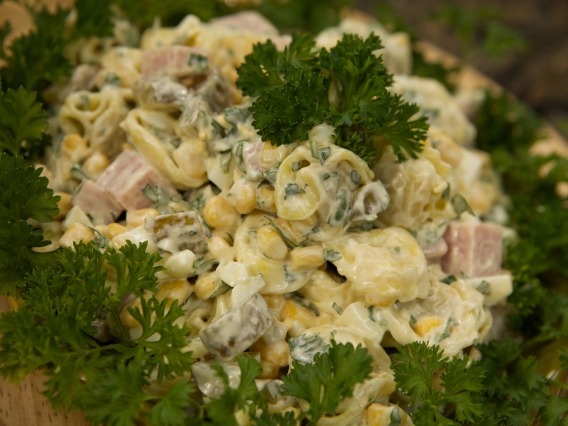 Tortellini ugotować i odcedzić. Przełożyć do szklanej miski. Dodać odsączoną kukurydzę i pokrojone w kostkę pozostałe składniki. Przyprawić do smaku. Dodać majonez i posypać natką pietruszki.