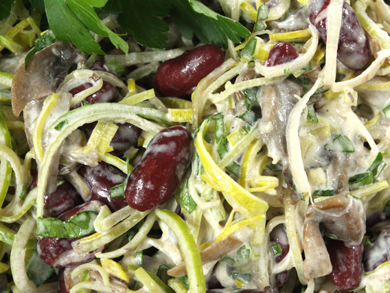 Pieczarki obrać i pokroić na plasterki. Usmażyć na maśle, na mocno rozgrzanej patelni. Przełożyć do miski. Dodać drobno pokrojony por (zmięknie w kontakcie z gorącą pieczarką). Wymieszać z odcedzoną fasolą, majonezem i posiekaną natką pietruszki. W razie potrzeby przyprawić do smaku solą i pieprzem. Udekorować gałązką pietruszki.
