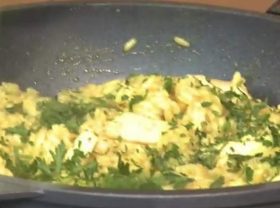 Na drugiej patelni rozgrzać oliwę. Kurczaka pokroić w cienkie „zapałki”. Dodać proszek curry i lekko przesmażyć - by wydobyć cały aromat z przyprawy. Podsmażonego kurczaka w curry dodać do ryżu. Na patelnię wlać wino, „wymyć smak”, przelać do risotta.