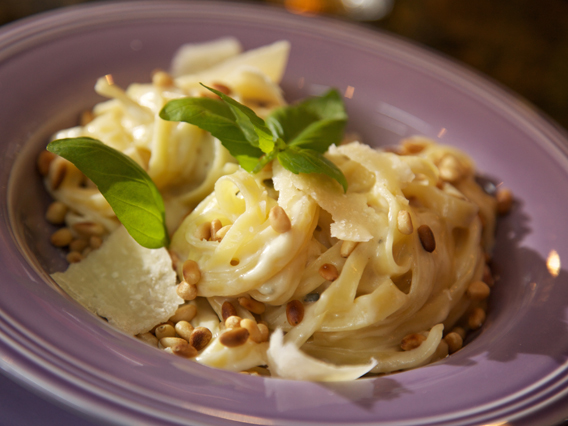 Makaron ugotować al dente i wrzucić na patelnię z sosem. Przełożyć na talerze. Tuż przed podaniem posypać tartym parmezanem i udekorować listkami bazylii.