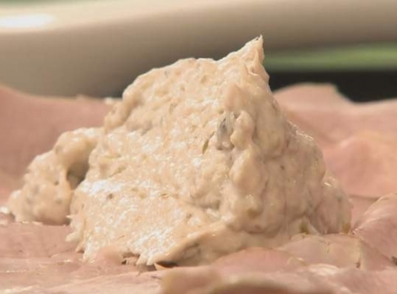 Upieczone i wystudzone mięso pokroić na cieniutkie plastry. Ułożyć na talerzu, na środek nałożyć sos. Udekorować kaparami i drobno posiekaną pietruszką.