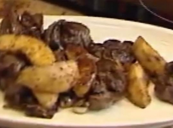 Na dużej patelni rozgrzać masło i wrzucić wątróbkę. Obsmażyć na ostrym ogniu ze wszystkich stron, zmniejszyć płomień, dodać cebulę pokrojoną w półplasterki, krótko podsmażyć i dodać jabłko pokrojone w ósemki.