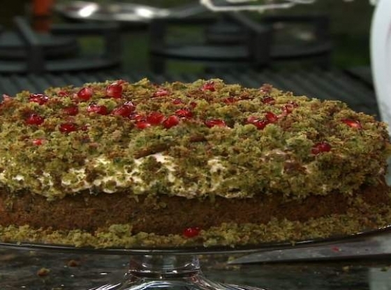 Po wystudzeniu odci±ć wierzch ciasta. Rozdrobnić. ¦mietanę ubić z cukrem waniliowym. Nałożyć na ciasto i równo rozsmarować. Posypać rozdrobnionym ciastem. Udekorować ziarenkami z granatu – owoc wystarczy przekroić i drewnian± pałk± wybić cał± zawarto¶ć.