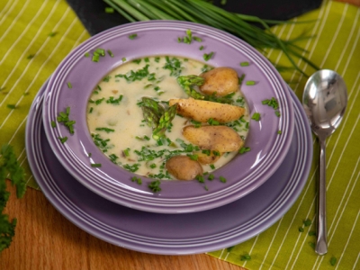 Ewa Wachowicz uwielbia wiosnę! W ogrodzie robi się kolorowo, wszystko wkoło zaczyna się zielenić a na targowiskach pojawiają się nowalijki. Nie może więc być inaczej - w kuchni zagoszczą warzywa! Jako pierwsza powstanie sałatka wiosenna z sałaty karbowanej, ogórków gruntowych, rzodkiewki, czerwonej cebuli, pomidorków i papryki. Zupa też będzie nawiązywać do pory roku, bowiem autorka programu ugotuje ją na bazie zielonych szparagów. Danie główne to kulinarna niespodzianka. Na talerzu pojawią się „żabie oczka” - kultowa potrawa z PRL-u. Z popularnym płazem mają niewiele wspólnego, bo to nic innego jak plastry panierowanej kiełbasy słoikowej (w oryginalnej recepturze mortadeli) z ułożonymi na wierzchu jajkami sadzonymi. Na deser Ewa upiecze ciasto czekoladowo-migdałowe.