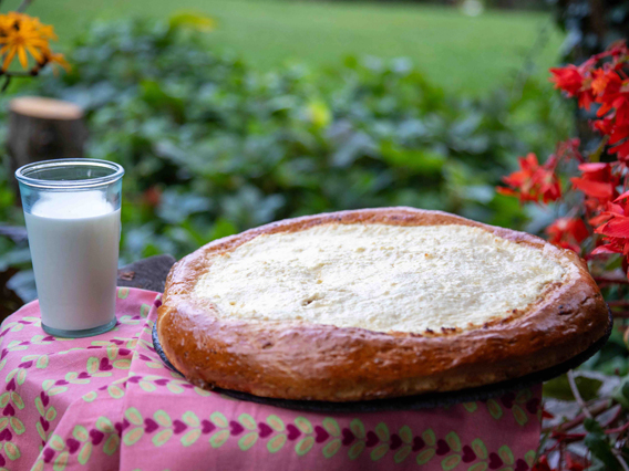 Z ciasta ulepić kulę i przełożyć na blachę wyścieloną papierem do pieczenia. Rozciągnąć podobnie jak na pizzę, robiąc duży placek. Dookoła uformować niewielki brzeg. Nałożyć farsz. Posmarować roztrzepanym jajkiem i odstawić na 15 minut.