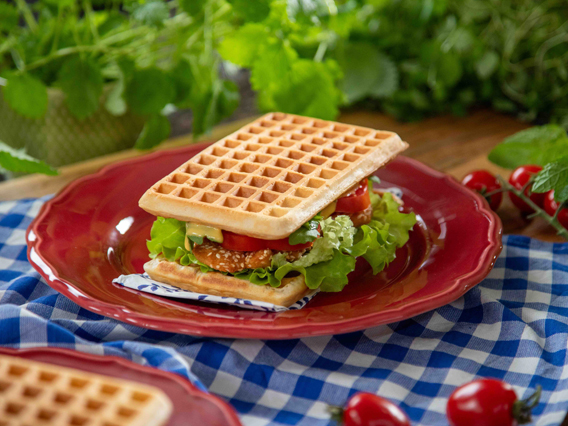 Na gofra dać li¶ć sałaty, na zieleninę usmażone fileciki z kurczaka, na mięso plastry pomidora i ogórka oraz rukolę. Przykryć drugim gofrem.