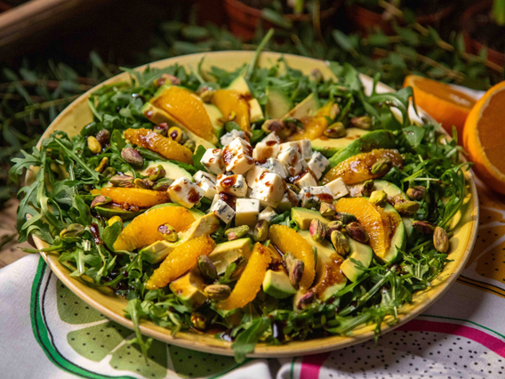 Rukolę ułożyć na talerzu. Awokado przekroić wzdłuż na pół, usunąć pestkę, miąższ naciąć w paski, skropić sokiem z cytryny, wyjąć za pomocą łyżki i umieścić na rukoli. Z pomarańczy wyciąć filety i ułożyć pomiędzy plastrami awokado. Dorzucić pokrojony w kostkę ser. Posypać pistacjami.