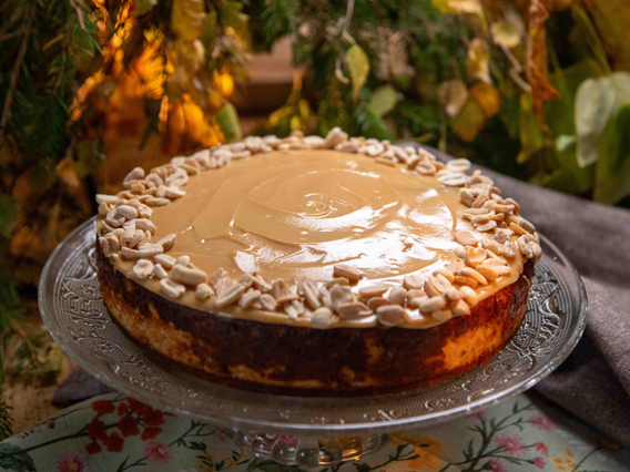 Czekoladę roztopić w garnuszku nad kąpielą wodną. Dodać masło orzechowe. Wlać śmietankę. Wymieszać. Polewą udekorować wystudzony sernik. Brzeg posypać orzeszkami ziemnymi.