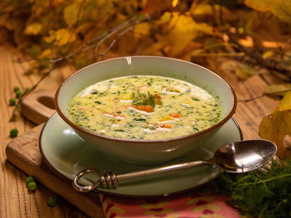 Zabielić mlekiem i zahartowaną śmietaną. Zagotować. Doprawić do smaku solą i pieprzem.