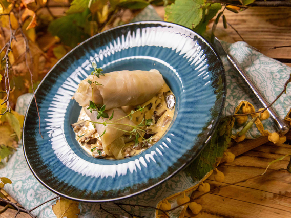 W tym czasie przygotować sos. Drobno posiekaną cebulę zeszklić na patelni na maśle. Dodać grzyby. Gdy się usmażą zalać śmietaną. Przyprawić solą i pieprzem. Dorzucić świeży tymianek. Zredukować.