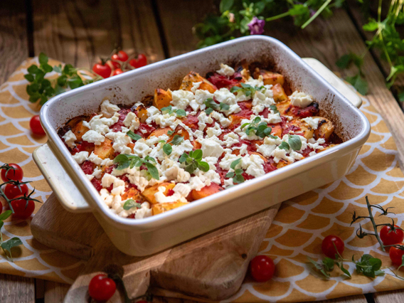 Wkruszyć fetę i zapiekać jeszcze przez chwilę. Udekorować listkami oregano.