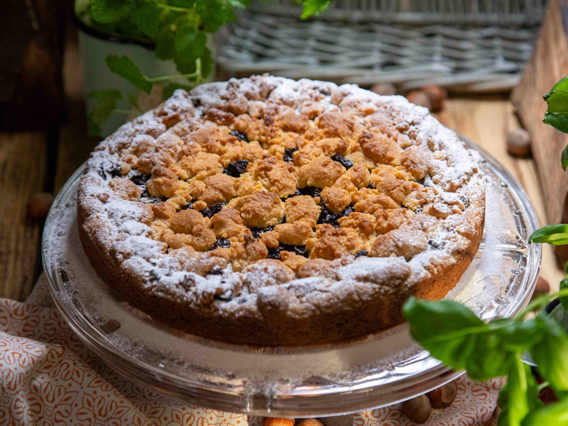Nałożyć farsz. Wyrównać. Na wierzchu ułożyć pokrojone w paski śliwki suszone i pokruszyć resztę ciasta.