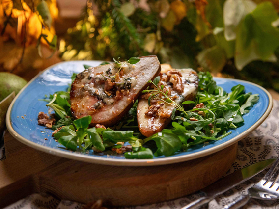Na talerzu rozłożyć rukolę i roszponkę. Na zieleninie umieścić zapieczone gruszki. Udekorować pokruszonymi orzechami. Polać oliwą.