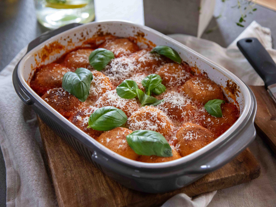 Zrobić sos. Posiekaną cebulę zeszklić na maśle. Pod koniec dodać pokrojony czosnek. Wlać przecier pomidorowy. Przyprawić oregano, solą i pieprzem. Przelać do naczynia żaroodpornego. Na sosie ułożyć arancini i na 20-25 minut wstawić do piekarnika rozgrzanego do 180 st. C.
