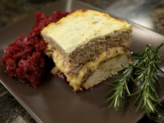 Na ser nałożyć warstwę mięsa mielonego, przygotowanego jak na sznycle (do mięsa dodać bułkę namoczoną w mleku - odciśniętą, jajko, czosnek przeciśnięty przez praskę oraz cebulę usmażoną na łyżce masła, przyprawić solą i pieprzem, wyrobić). Wyrównać, docisnąć.